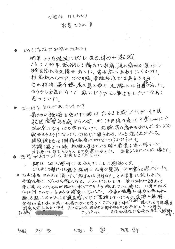 Q. どのようなことでお悩みでしたか? 昨年4カ月程床に伏し、気力体力が激減。さらに一昨年、転倒して痛めた右肩、腕の痛みが悪化し、日常生活にも支障があった。首も右にまわりにくかった。椎間板ヘルニア、すべり症、骨粗鬆症ではあるものの、白山林道、高千穂、屋久島と歩き、足腰には自信があった。もう少し元気になって、庭いじりや山歩きをしたいなあと思っていた。